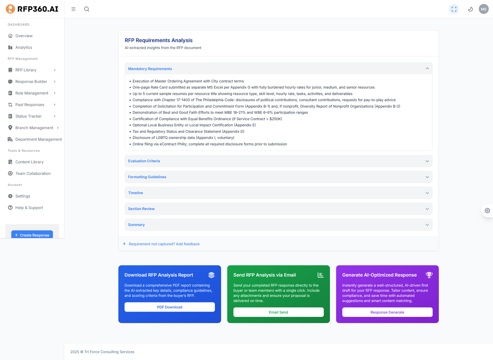 Manual review of proposals is slow and error – prone and critical details often get overlooked. TENDER360.AI changes that by acting as your AI – powered analyst, reviewing submissions, flagging risks, and identifying insights that humans might miss.